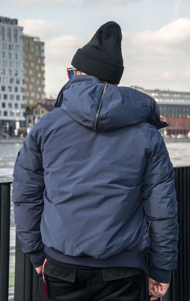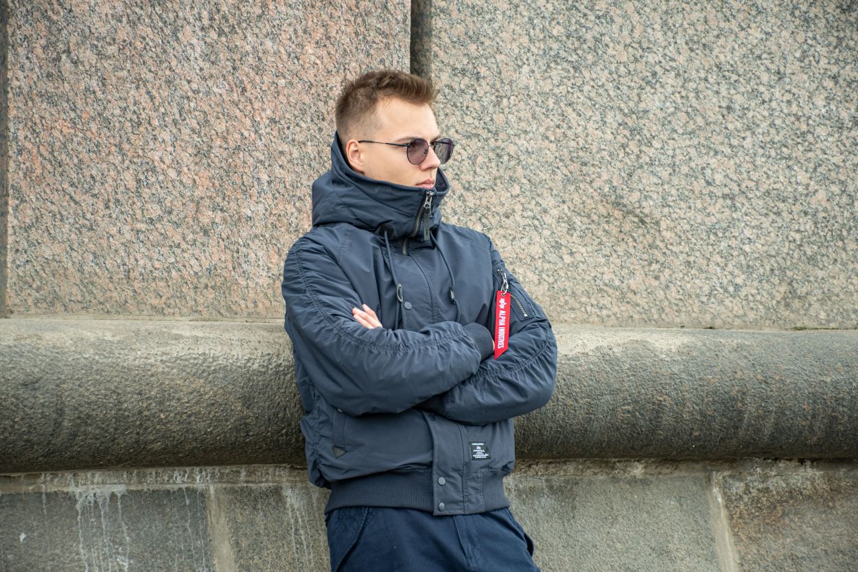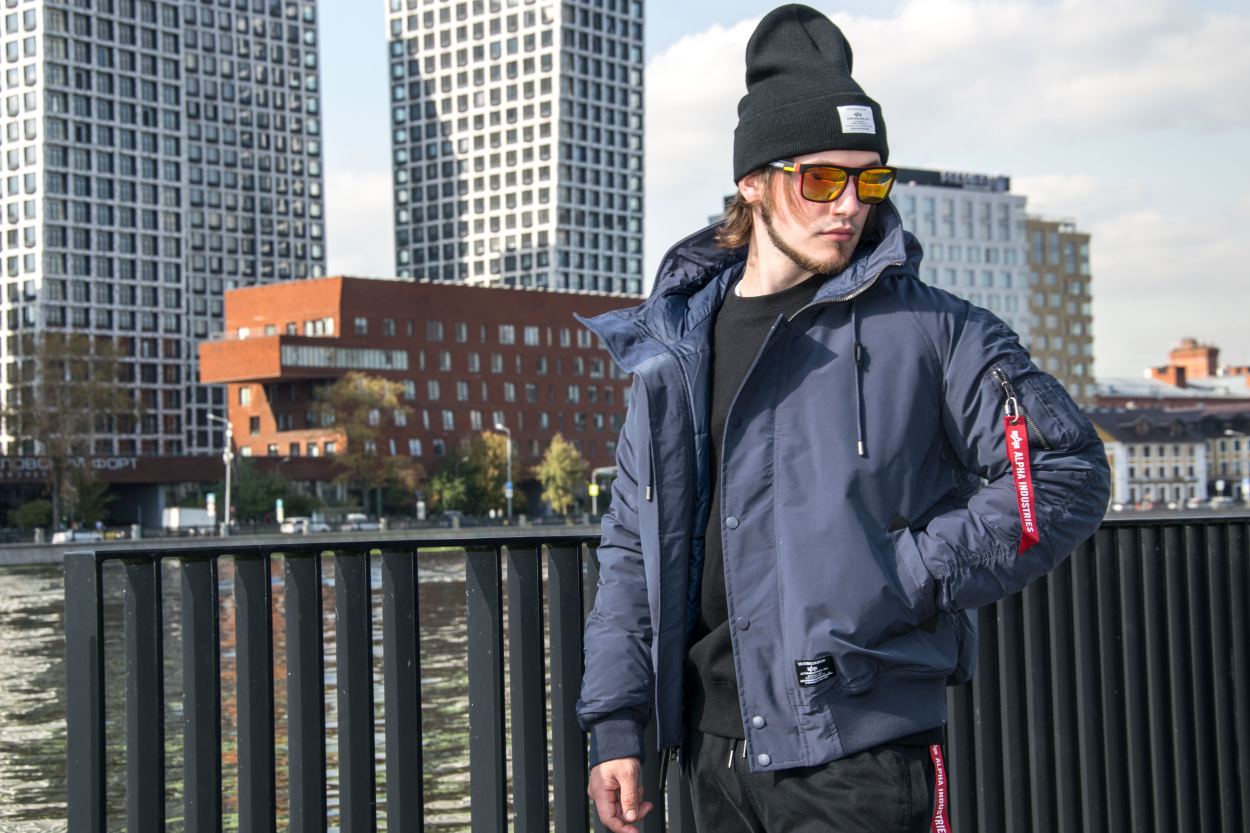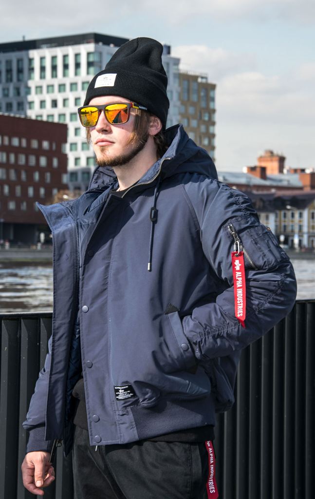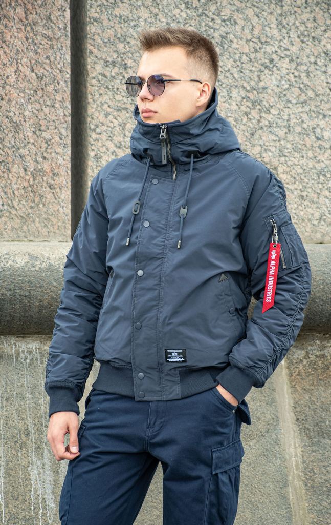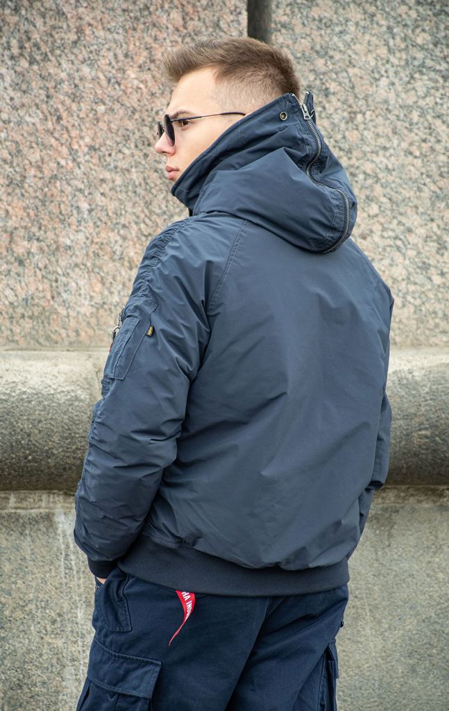 Еще одна синяя версия короткой мужской аляски Альфа Индастриз N-2B Altitude - прошлогодняя модель. Она чуть более теплого оттенка синего, но по крою она ничем не отличается от более современной модели. Эта модель короткой аляски отлично подойдет для тех, кто ищет более бюджетную версию легендарной короткой аляски. Сочетаем с объемными брюками парашют Alpha Industries M-65 и более комфортными трикотажными джоггерами.