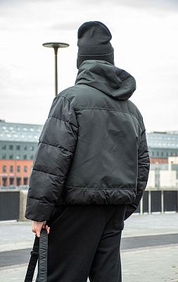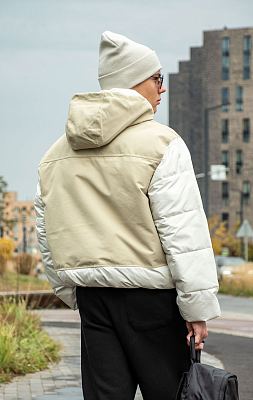 Съёмный трикотажный капюшон контрастного цвета фиксируется на молнии по горловине и вдоль борта и позволяет совместить в одной вещи и толстовку, и верхнюю куртку.