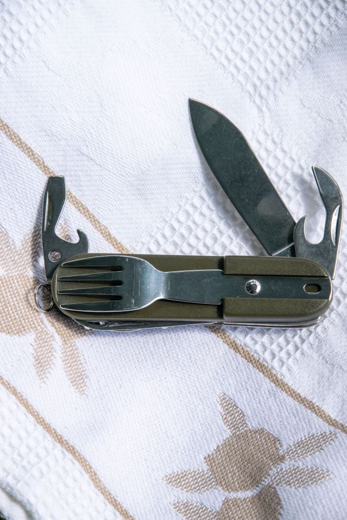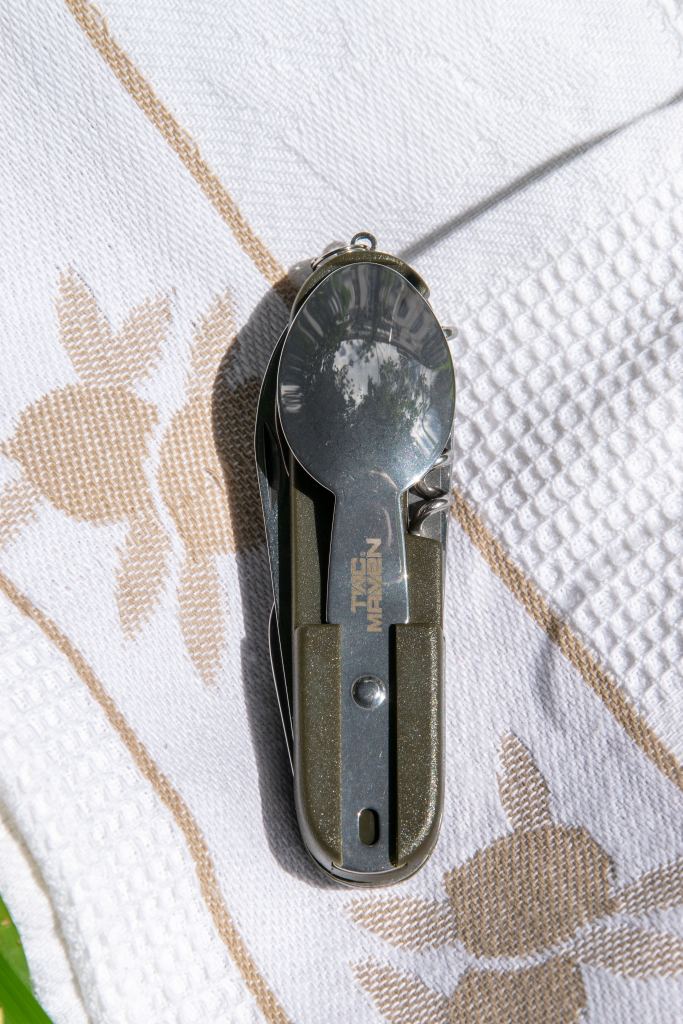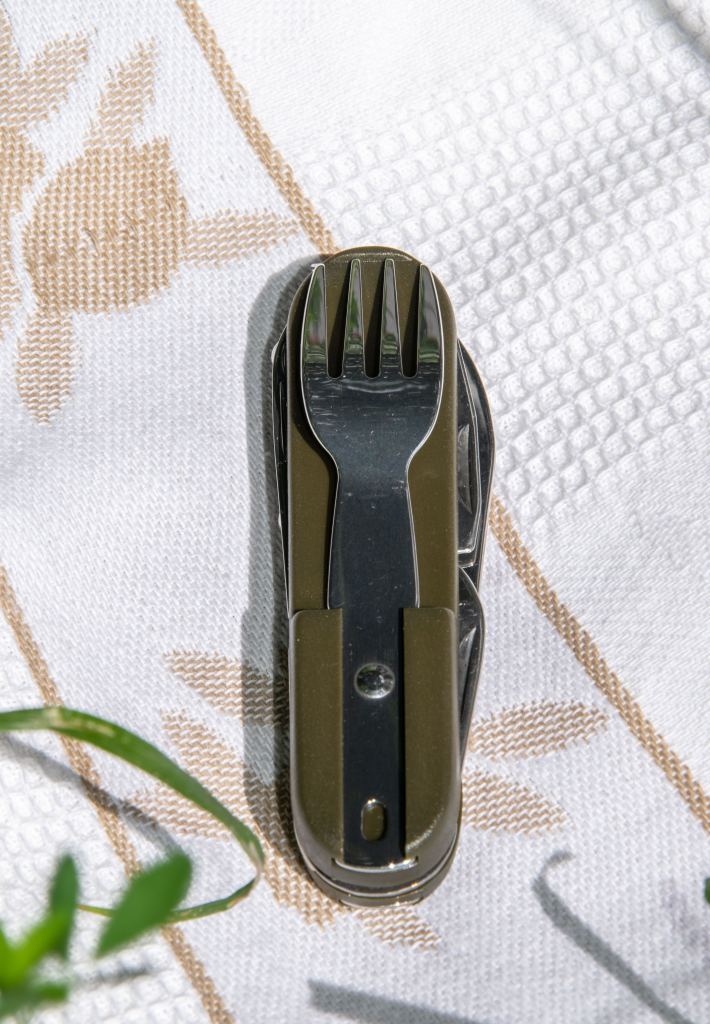 Столовый набор Olaf от компании Pentagon – это не просто комплект вилки, ложки и ножа, а настоящий кемпинговый мультитул! Прежде всего, это полноценный складной нож с удобной для хвата рукоятью. Все металлические компоненты в нем выполнены из нержавеющей стали марки 420, а накладки рукояти – из ударопрочного пластика. Широкий полноценный клинок ножа позволяет использовать его не только для нарезки продуктов, но и для полноценных работ по лагерю. По бокам рукояти ножа вложены две насадки – вилка и ложка. Каждую из них можно снять, установить в паз рукояти и получить один из двух полноценных столовых приборов. А если вилку и ложку нужно вымыть, насадки просто снимаются для чистки и просушки, оставляя нож полностью функциональным! Ведь в рукояти помимо клинка спрятаны бутылочная открывалка, совмещенная с шлицевой отверткой, консервный нож, штопор и шило. Наконец, рукоять снабжена кольцом для подвеса или темляка, который можно сплести из паракорда. В комплекте чехол для хранения. Olaf станет отличным перочинным ножом для тех, кто всегда находится в движении и никогда не знает, где ждет его следующий обед – за столом в своей квартире или на берегу дикой реки, в окружении лесов.